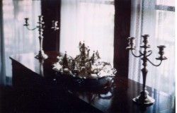 Ward – Summer House – Dining Room. Stairway down five steps to door opening to porte cochere. Carved wooden pieces on the silverware chests are knife holders, lid lifts from the middle, and inside are places for each knife to be inserted.